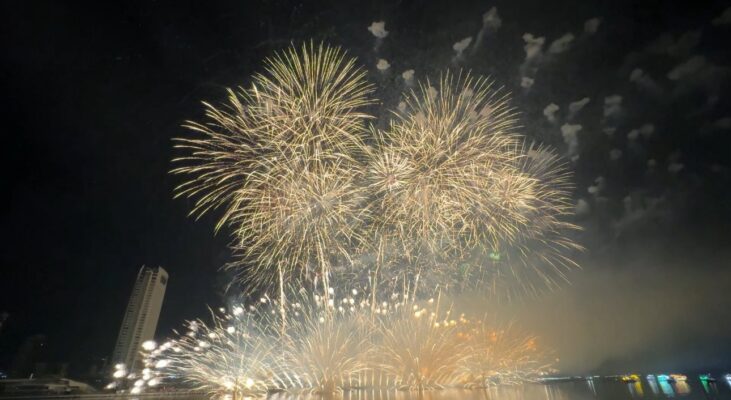 – Chiều nhà mình tắm biển nhanh nhảu rồi đi xem pháo hoa. Trời ơi thật không phí tiền khi lựa chọn xem ở khán đài chính diện, pháp sư Trung Hoa quả không làm người xem thất vọng. Bạn Na Review dặn mình rất kĩ từ đoạn gửi xe ở đâu, ngồi chỗ nào, ….rất có tâm